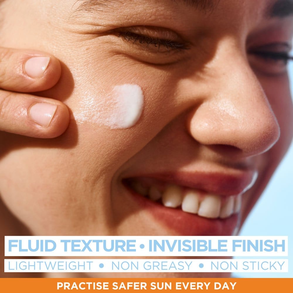 The Garnier Ambre Solaire Protection Fluid offers a high level of SPF protection combined with a lightweight and moisturizing formula. Infused with hyaluronic acid and vitamin E, this fluid is designed to help prevent dark spots caused by the sun and to guard against oxidative stress from pollution. It absorbs quickly into the skin, leaving no greasy residue behind.