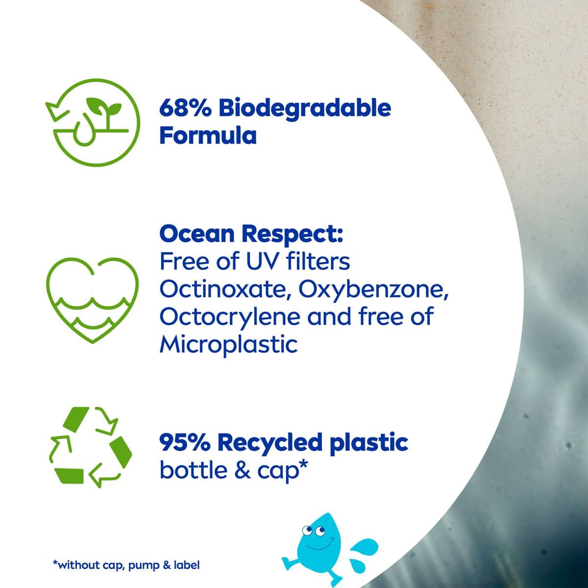 Our formula is 68% biodegradable and is free from certain UV filters such as Octinoxate, Oxybenzone, and Octocrylene, as well as microplastics, making it a more environmentally friendly choice.