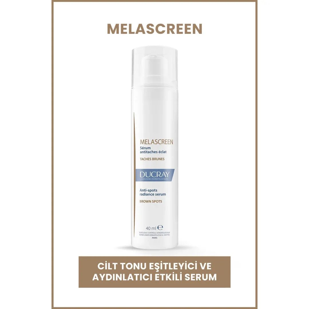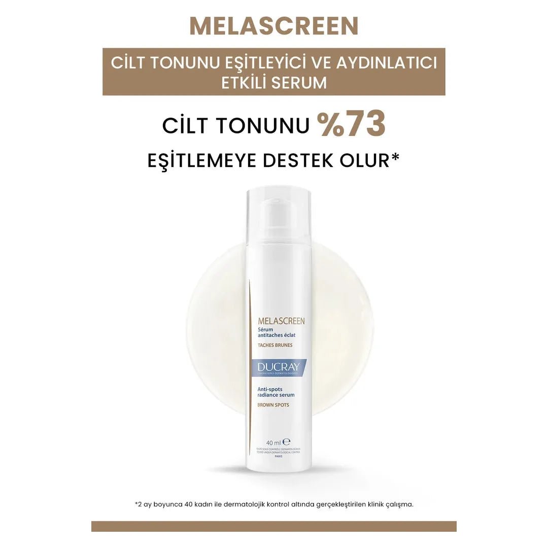 - Ducray Melascreen Cilt Tonu Eşitleyici ve Aydınlatıcı Etkili Serum, cildin doğal parlaklığını %88 artırmaya 1 ve cilt tonunu %73 oranında eşitlemeye 2 destek olur. 24 saat boyunca nemlendiciri etki 2 sunan Melascreen Serum hamilelik ve emzirme döneminde kullanılabilir.